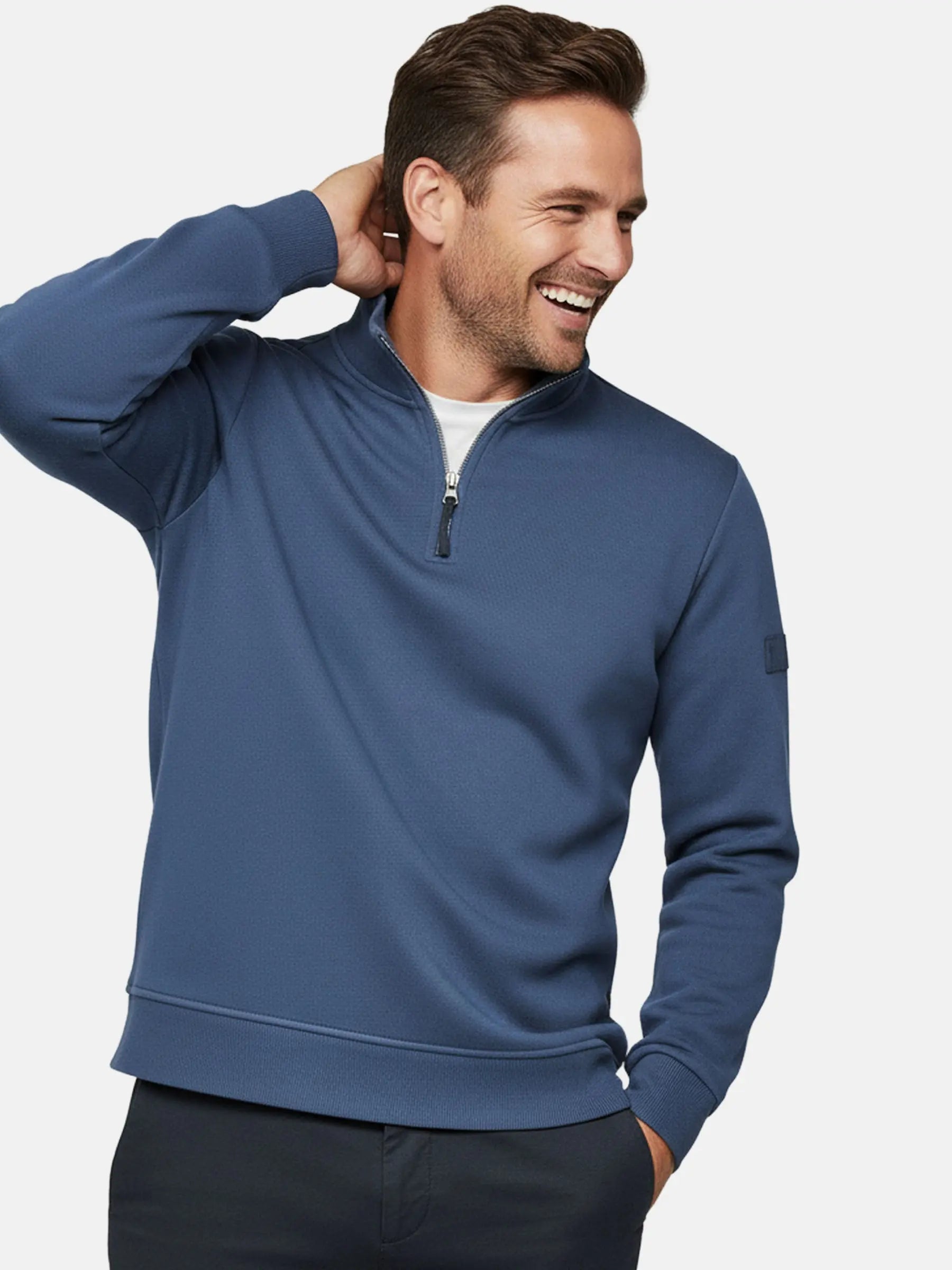 Dieser Pullover ist ein langärmeliges Kleidungsstück für den täglichen Gebrauch. Er ist mit einem halben Reißverschluss ausgestattet, der ein einfaches An- und Ausziehen ermöglicht und unterschiedliche Tragevarianten bietet. Die glatte Oberfläche sorgt für eine gleichmäßige Optik und einen sauberen Sitz.