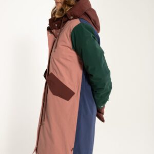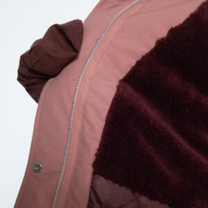 Dieser Wintermantel besteht aus einer Baumwoll-Nylon-Mischung und ist für den Einsatz bei kalten und nassen Wetterbedingungen vorgesehen. Das Material ist wind- und wasserdicht mit versiegelten Nähten und einer Wassersäule von 5.000 mm sowie atmungsaktiven Eigenschaften. Eine fluoridfreie Oberflächenbehandlung ergänzt die Wetterschutzfunktion. Der Mantel verfügt über ein wärmendes Innenfutter, eine Kapuze mit Kordelzug, einen verdeckten Frontverschluss mit Reißverschluss und Druckknöpfen, verstellbare Ärmelabschlüsse sowie seitliche Taschen. Ein Taillenzug ermöglicht eine individuelle Passform und zusätzliche Bewegungsfreiheit.